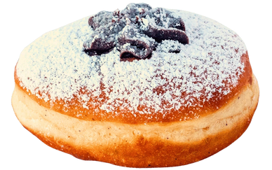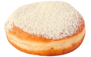 A classic jelly filled donut dusted with powdered sugar
