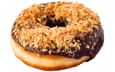 Yeast donut with Ghiradelli chocolate glaze, sweetened coconut, toasted coconut, and drizzled with handmade caramel.